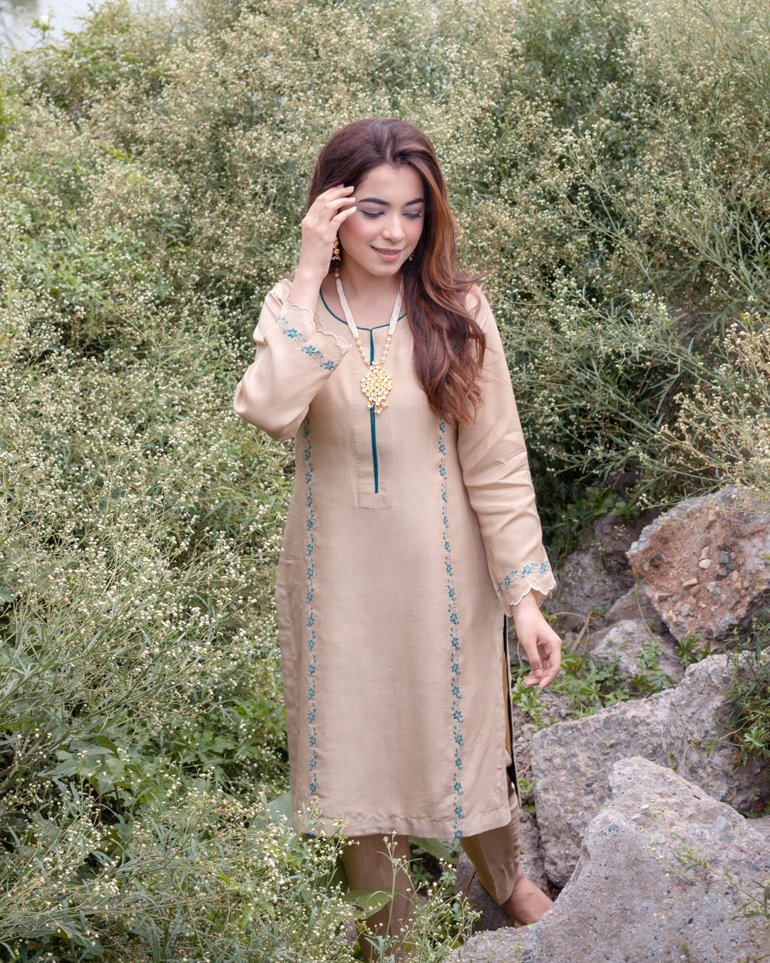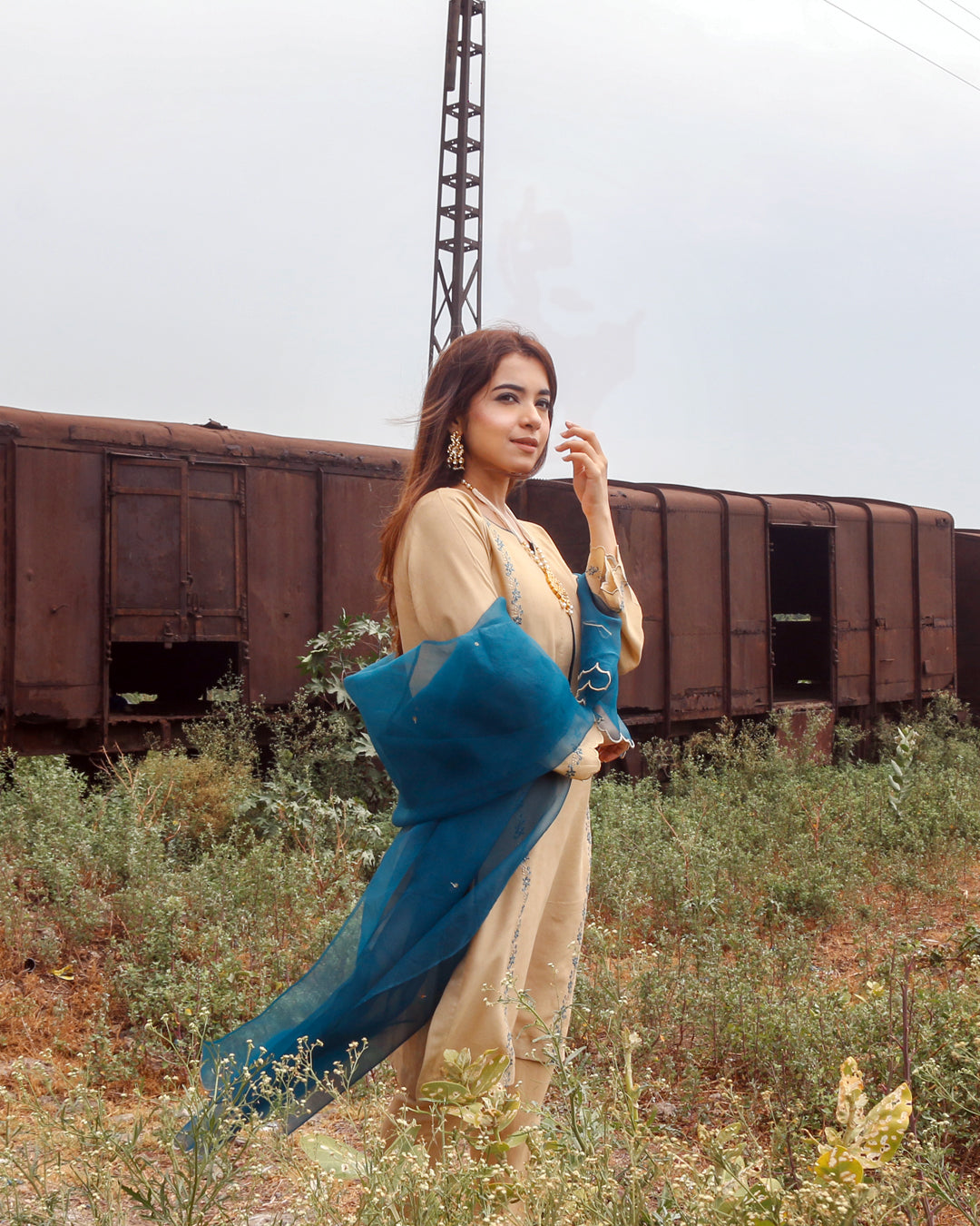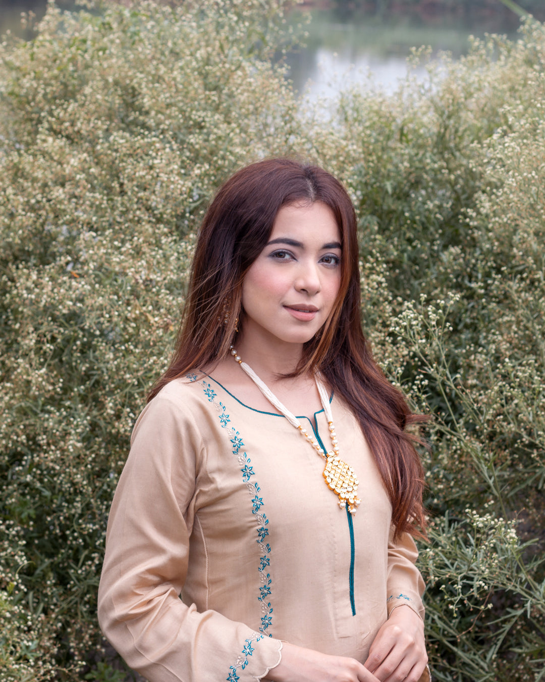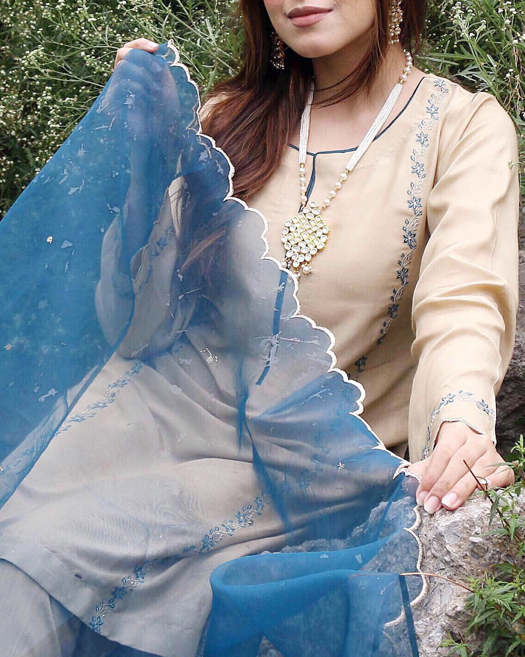 A subtle beige dress with embroidery details with a hint of teal color with golden tilla. Paired with sheer organza teal dupatta with tilla scallops on all sides.
