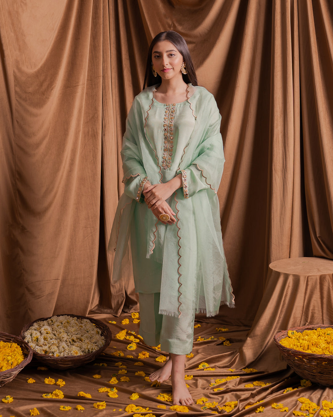 'Fariba' from our Eid Collection ‘یارِمن’. Golden Tilla and Gotta detail on the neckline and sleeves with gotta spray on the shirt and sheer organza dupatta with tilla scallops paired with matching trousers.