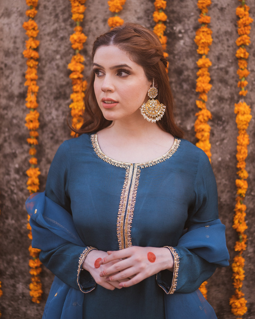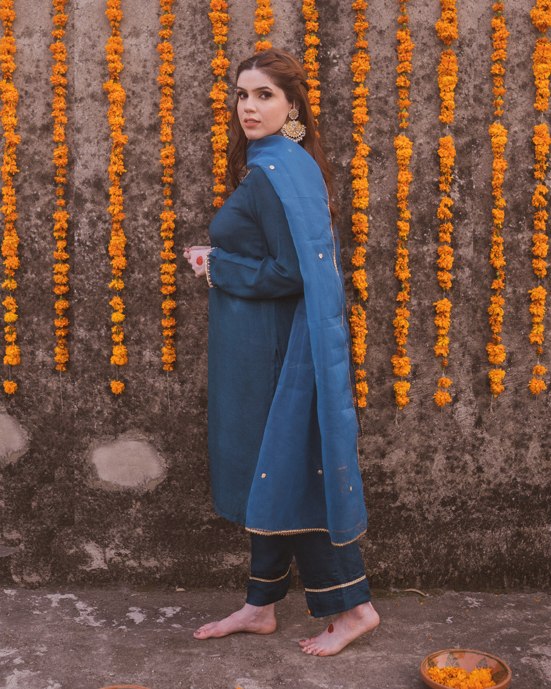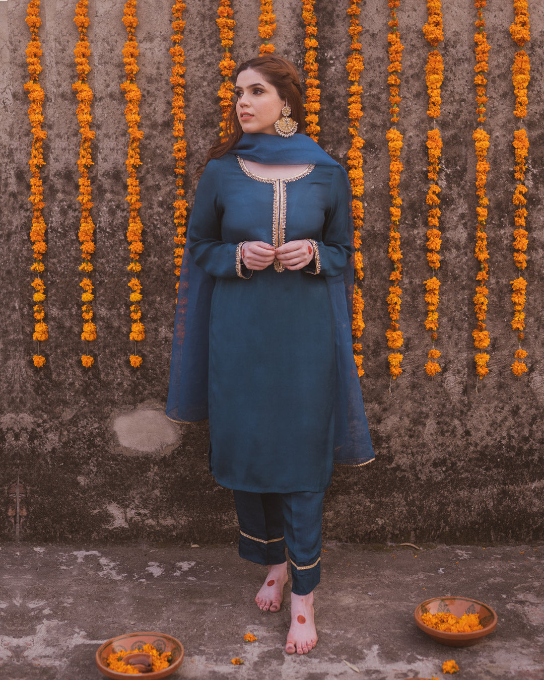 Embellished Silk shirt with matching trouser paired with gota spray organza dupatta.