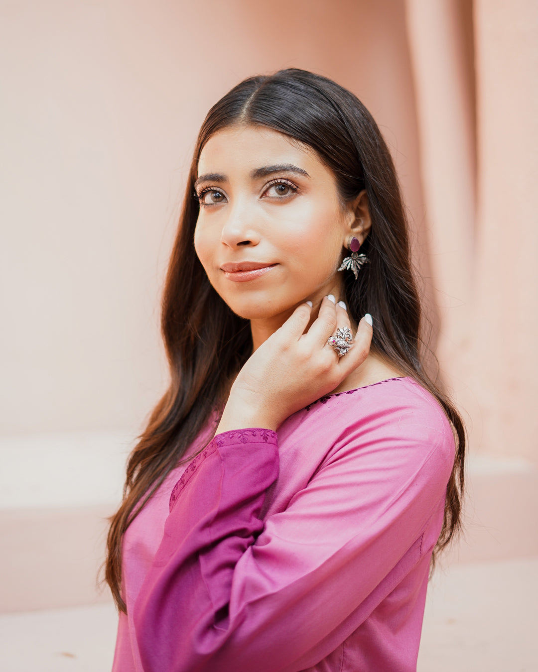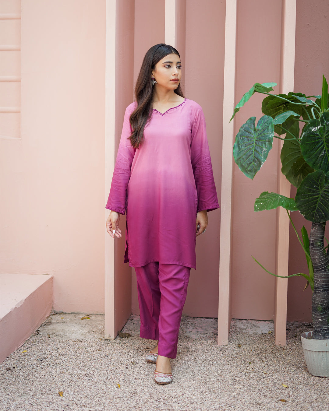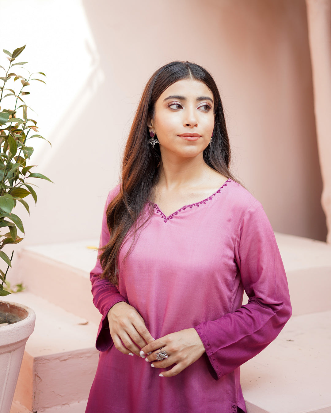 A straight ombre dyed shirt in shades of pink with intricate embroidery details, paired with matching trousers.