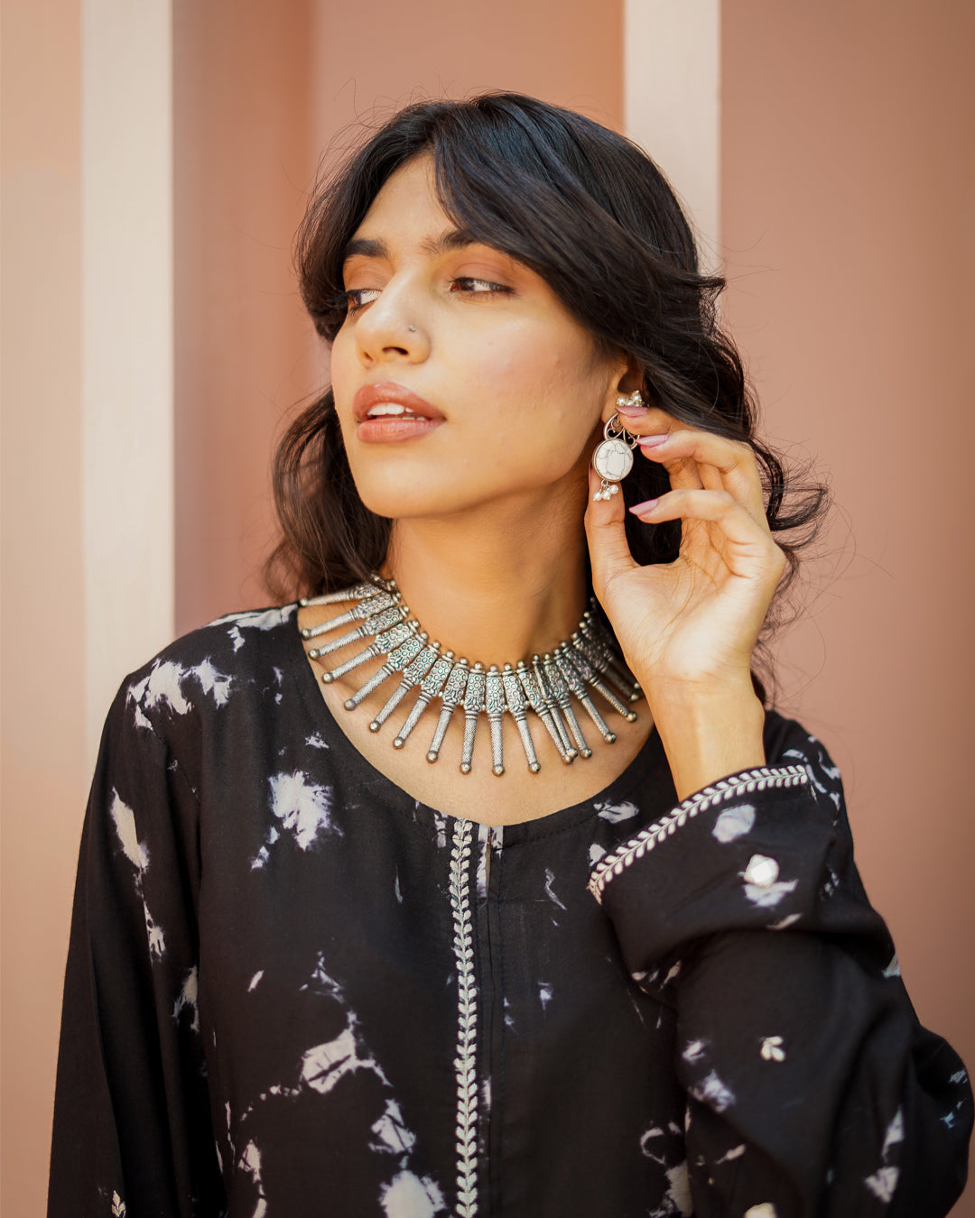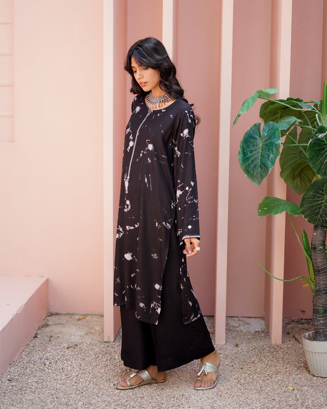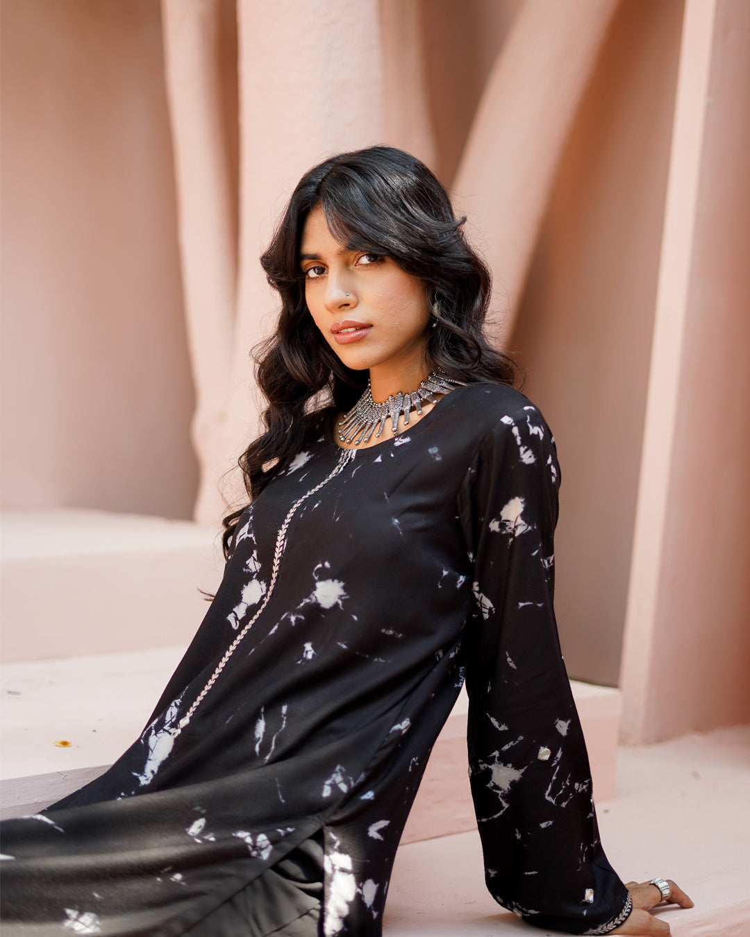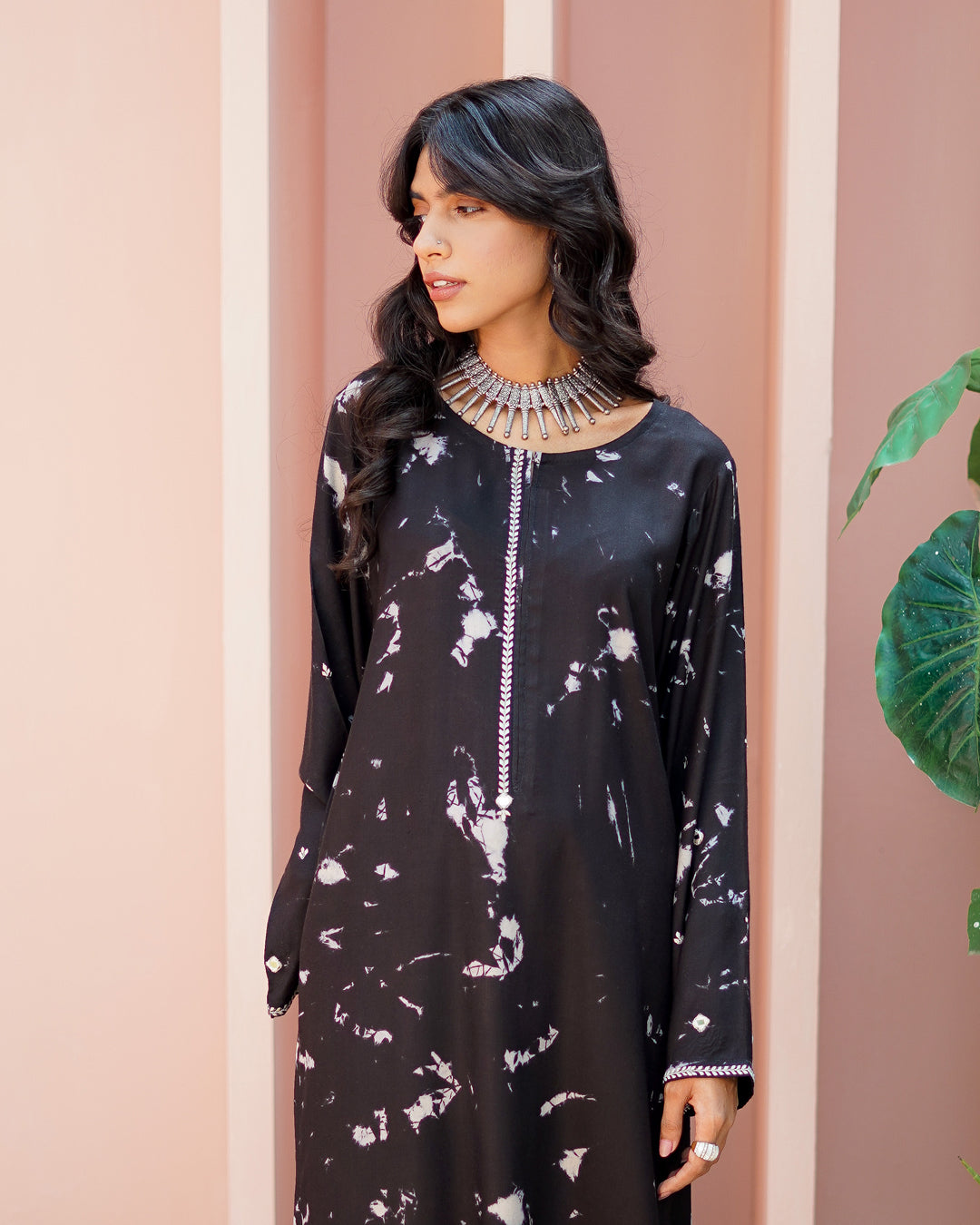 Black and beige Tie and Dye regular-fit shirt with intricate embroidery details, paired with plain culotte pants.