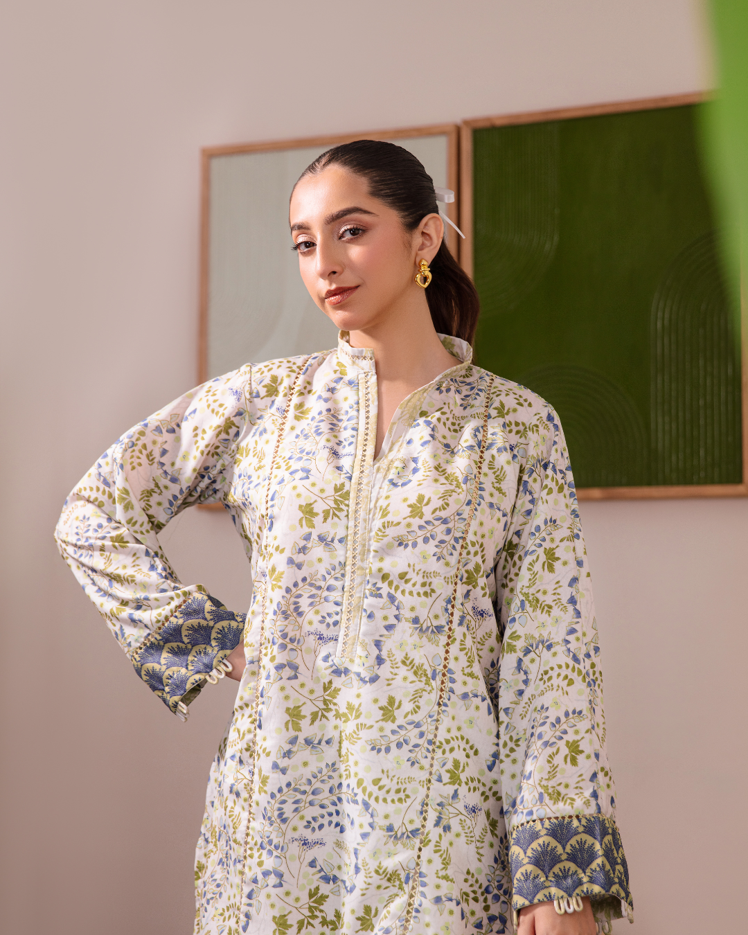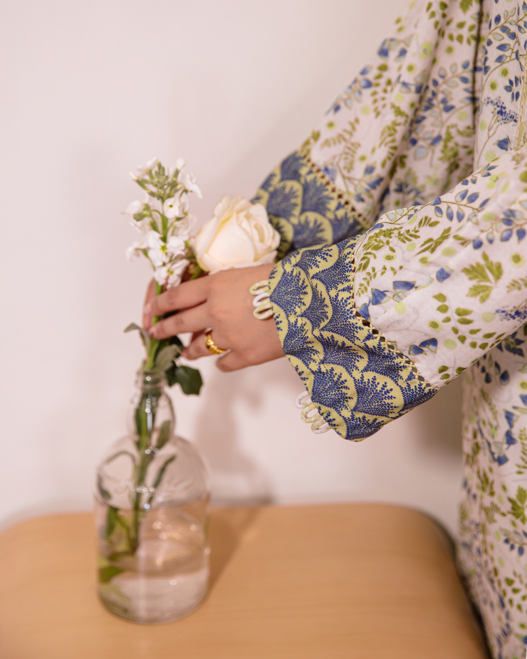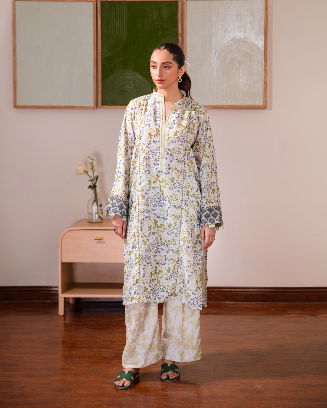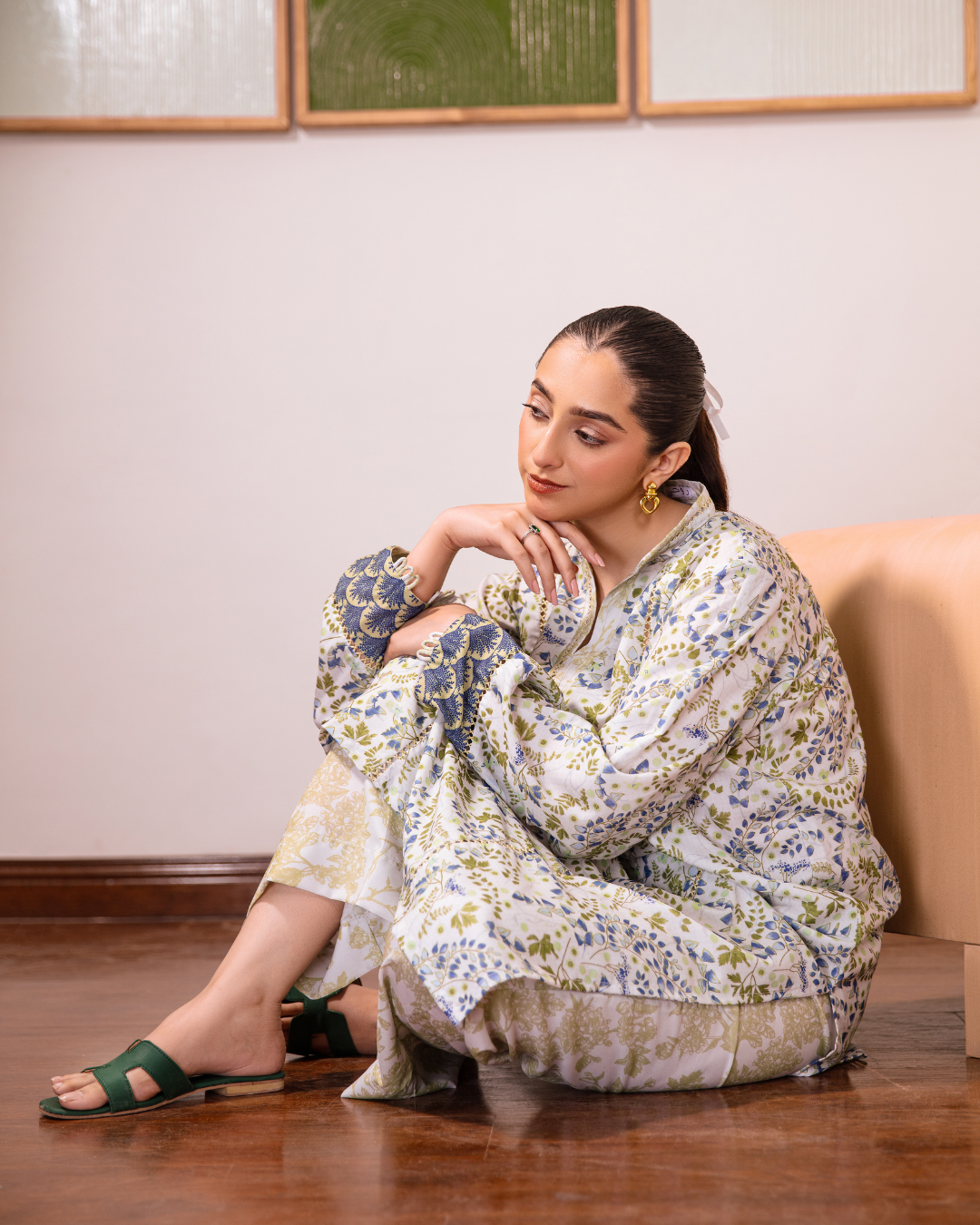 Our green floral print loose-fit long kurta offers a refreshing and vibrant look, perfect for a laid-back yet stylish vibe. The delicate lace details on the neckline adds an intricate charm to the piece. Paired with wide cropped hem pants, the outfit achieves a perfect balance of modern elegance and comfort. Ideal for casual settings, this ensemble is certainly a fashion-forward design.