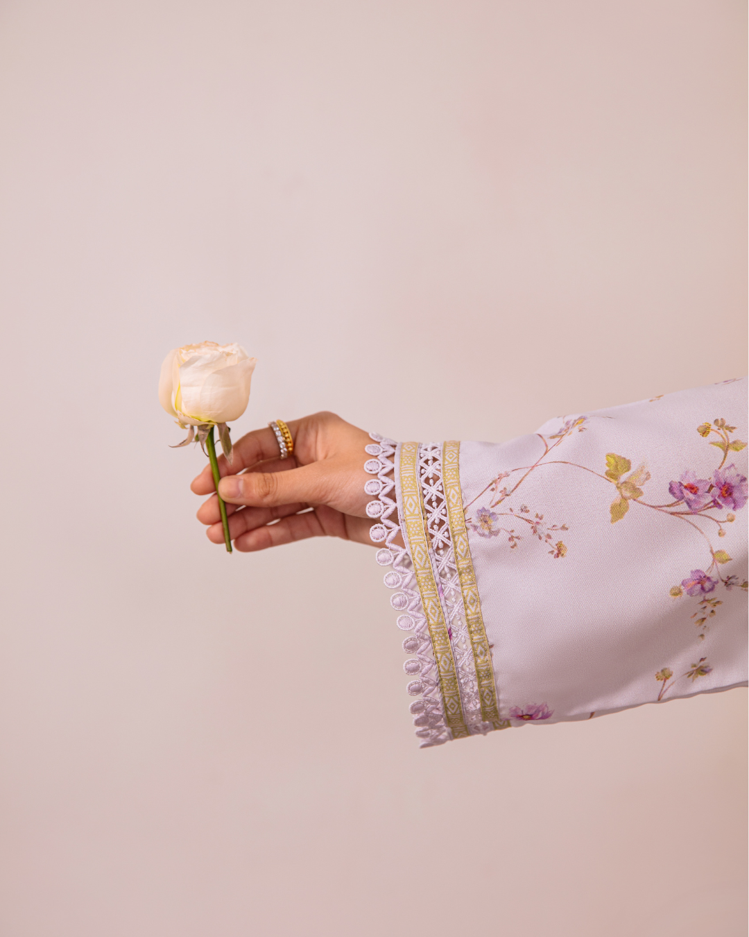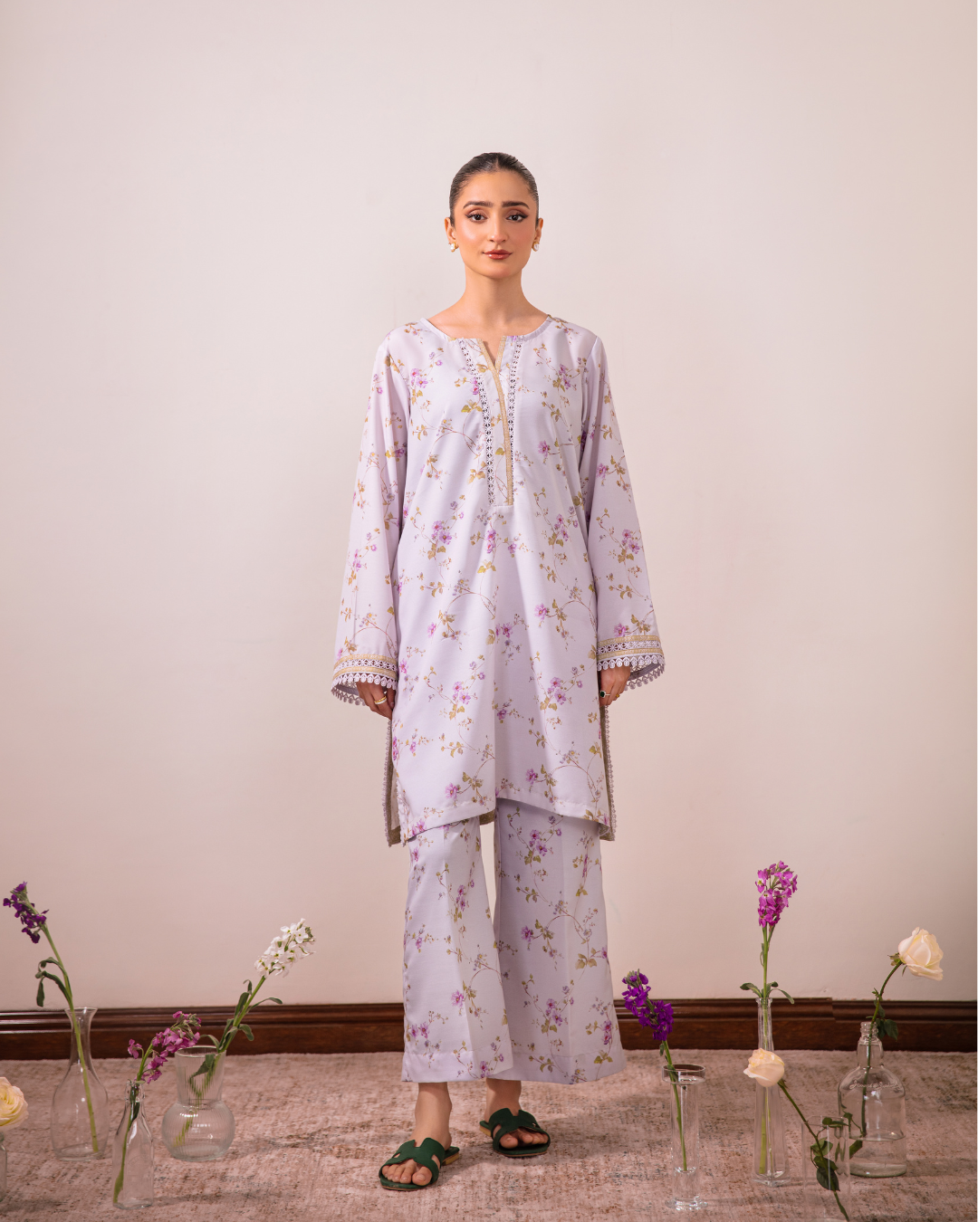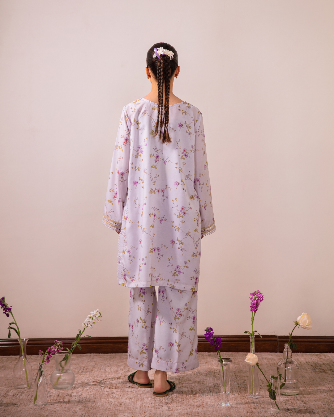 This floral regular-fit short kurta features intricate details on the neckline and sleeves. Its pastel floral print with matching cropped wide-hem pants achieves a perfect balance of modern style and comfort. The contrasting green color details add a contemporary edge, complementing the floral design of the kurta.